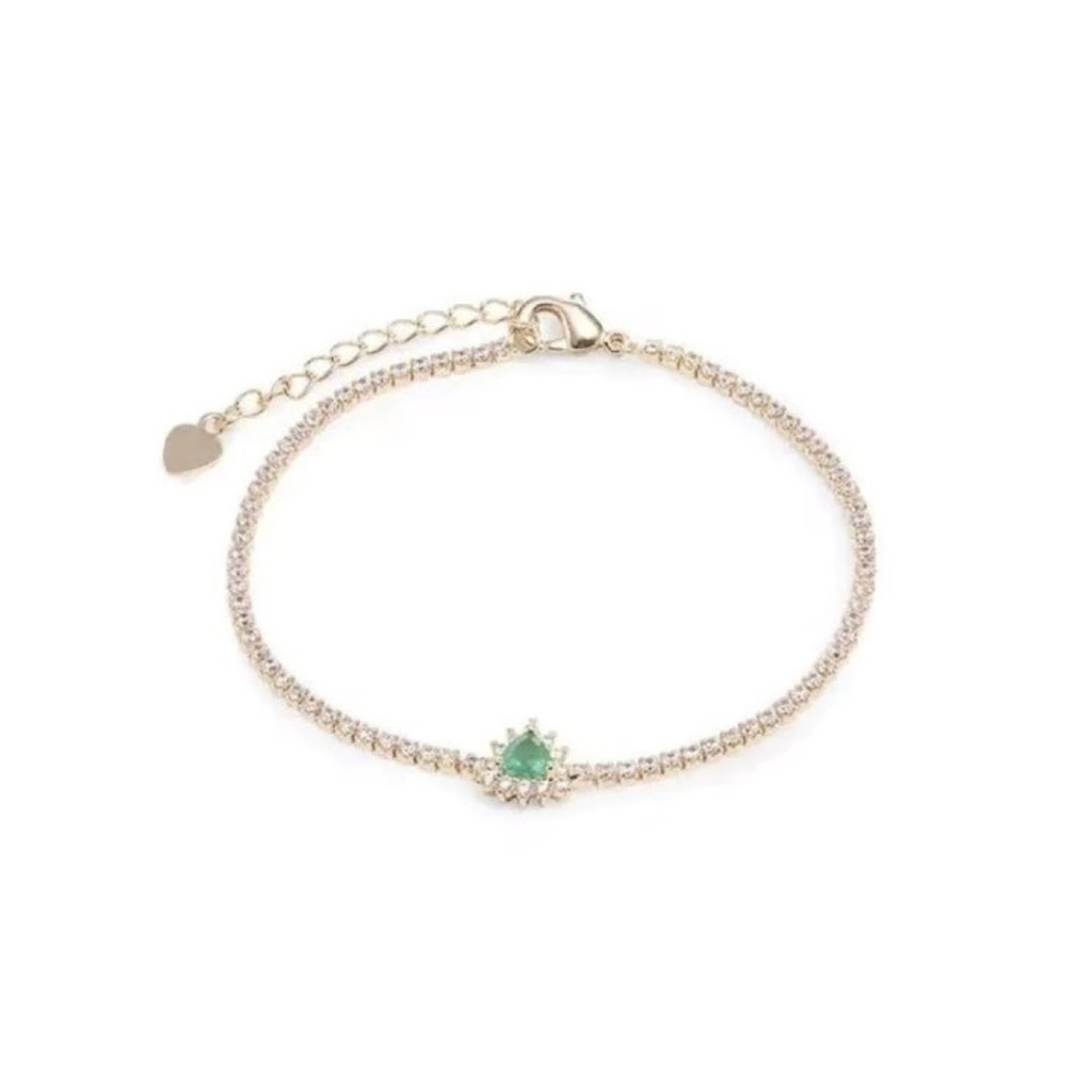 Com design sofisticado e atemporal, a Pulseira Cristal Esmeralda Trillon traz um cristal esmeralda central lapidado em formato triangular, cercado por delicadas zircônias brancas que realçam ainda mais o seu brilho. O banho em ouro 18k confere elegância e durabilidade à peça, tornando-a perfeita para ocasiões especiais ou para elevar produções do dia a dia com charme sutil e refinado.