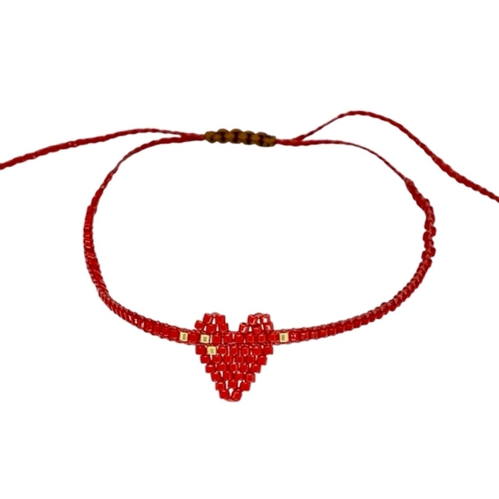 A Pulseira Miyuki Coração Vermelha é produzida artesanalmente com micro miçangas importadas, formando um coração minuciosamente trançado em um tom vibrante que transmite força, amor e autenticidade.